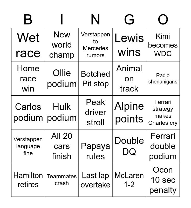 This bingo card has 25 words: All 20 cars finish, Last lap overtake, Botched Pit stop, Hamilton retires, Kimi becomes WDC, Wet race, Home race win, New world champ, Alpine points, Papaya rules, Animal on track, Carlos podium, Double DQ, Ferrari double podium, Ollie podium, Ocon 10 sec penalty, Ferrari strategy makes Charles cry, Verstappen to Mercedes rumors, Radio shenanigans, Hulk podium, Peak driver stroll, Teammates crash, Verstappen language fine, Lewis wins and McLaren 1-2.