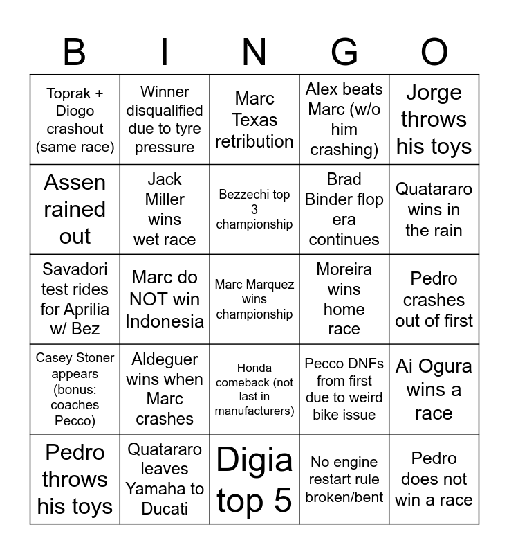 This bingo card has a free space and 24 words: Aldeguer wins when Marc crashes, Quatararo leaves Yamaha to Ducati, Bezzechi top 3 championship, Pedro throws his toys, Jorge throws his toys, Toprak + Diogo crashout (same race), Assen rained out, Winner disqualified due to tyre pressure, Moreira wins home race, Honda comeback (not last in manufacturers), Brad Binder flop era continues, Savadori test rides for Aprilia w/ Bez, Pecco DNFs from first due to weird bike issue, Ai Ogura wins a race, Jack Miller wins wet race, No engine restart rule broken/bent, Pedro crashes out of first, Marc Texas retribution, Quatararo wins in the rain, Marc do NOT win Indonesia, Pedro does not win a race, Casey Stoner appears (bonus: coaches Pecco), Alex beats Marc (w/o him crashing) and Digia top 5.
