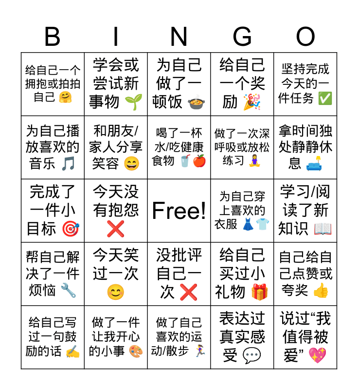 This bingo card has a free space and 24 words: 今天笑过一次 😊, 做了一件让我开心的小事 🎨, 喝了一杯水/吃健康食物 🥤🍎, 给自己写过一句鼓励的话 ✍️, 坚持完成今天的一件任务 ✅, 给自己一个拥抱或拍拍自己 🤗, 为自己播放喜欢的音乐 🎵, 学会或尝试新事物 🌱, 为自己穿上喜欢的衣服 👗👕, 没批评自己一次 ❌, 做了一次深呼吸或放松练习 🧘♀️, 完成了一件小目标 🎯, 给自己买过小礼物 🎁, 自己给自己点赞或夸奖 👍, 和朋友/家人分享笑容 😄, 表达过真实感受 💬, 学习/阅读了新知识 📖, 为自己做了一顿饭 🍲, 拿时间独处静静休息 🛋️, 今天没有抱怨 ❌, 说过“我值得被爱” 💖, 帮自己解决了一件烦恼 🔧, 给自己一个奖励 🎉 and 做了自己喜欢的运动/散步 🏃♀️.