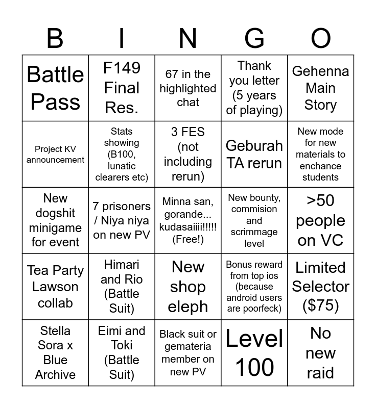 This bingo card has a free space and 24 words: Himari and Rio (Battle Suit), Eimi and Toki (Battle Suit), 3 FES (not including rerun), Stella Sora x Blue Archive, Gehenna Main Story, Battle Pass, Project KV announcement, F149 Final Res., New bounty, commision and scrimmage level, New shop eleph, Geburah TA rerun, New dogshit minigame for event, Bonus reward from top ios (because android users are poorfeck), Limited Selector ($75), Stats showing (B100, lunatic clearers etc), Level 100, >50 people on VC, 67 in the highlighted chat, New mode for new materials to enchance students, 7 prisoners / Niya niya on new PV, No new raid, Tea Party Lawson collab, Thank you letter (5 years of playing) and Black suit or gemateria member on new PV.