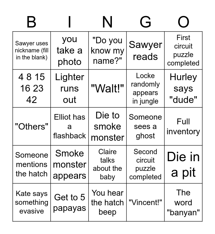 This bingo card has a free space and 24 words: Smoke monster appears, Get to 5 papayas, "Walt!", Kate says something evasive, First circuit puzzle completed, Sawyer uses nickname (fill in the blank), 4 8 15 16 23 42, you take a photo, Someone sees a ghost, Claire talks about the baby, Locke randomly appears in jungle, "Others", Second circuit puzzle completed, Die in a pit, Lighter runs out, "Vincent!", Full inventory, "Do you know my name?", Hurley says "dude", Elliot has a flashback, The word "banyan", Someone mentions the hatch, Sawyer reads and You hear the hatch beep.