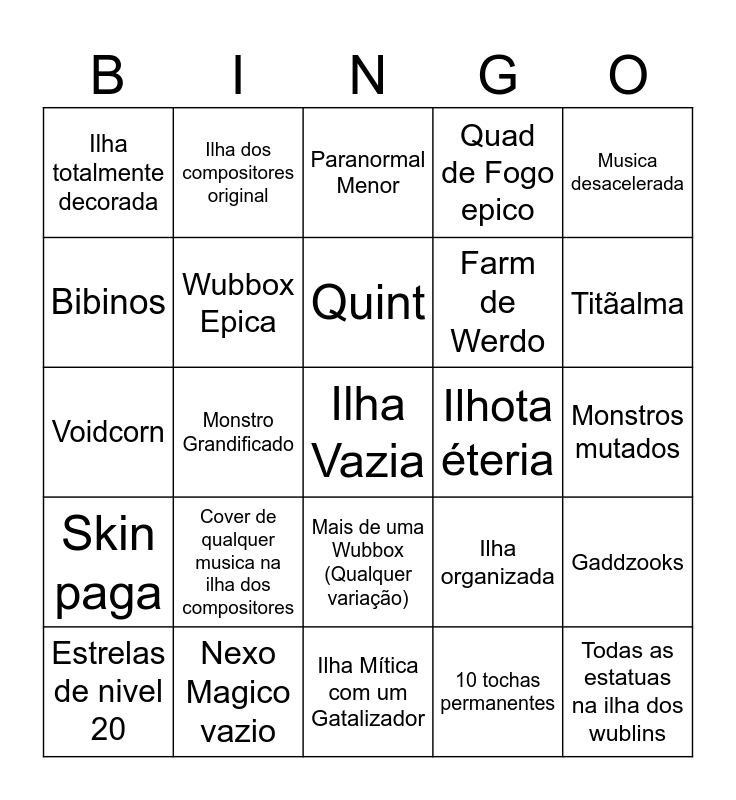 This bingo card has 50 words: Musica Completa, Ilha Vazia, Apenas o baixo do castelo, Ilha Mítica com um Gatalizador, Cover de qualquer musica na ilha dos compositores, Compositor só com um Mamutinho, Ilha dos compositores original, Primordial, Bibinos, Wublin Epico, Wubbox Epica, Quad de Fogo epico, Gaddzooks, Ilha organizada, Baquetador Raro, Atelie com apenas um Mebequim, Quint, Ilhota éteria, Musica acelerada, Musica desacelerada, Monstro Grandificado, 10 tochas permanentes, Ilha totalmente decorada, Farm de Werdo, Farm de Zynth, Todas as estatuas na ilha dos wublins, Titãalma, Carnaval Paranormal completo, Paranormal Menor, Mais de uma Wubbox (Qualquer variação), 5 padarias, Eterio epico de dois elementos, CG5, Celestial Adulto, Nexo Magico vazio, Nexo Magico completo, Arte de glowbes, Instalação e creche comuns, > 10000 Starpower, Monstros mutados, Coliseu com < 5 bichos, Coliseu com pelo menos dois eterios, Padaria finalizada, Ilha eteria apenas com dipsters, Estrelas de nivel 20, Voidcorn, Todos com trajes, Skin sazonal, Skin paga and Baiacu-Fole na ilhota de mech acompanhado com 3 Vhenshuns e um Piplash logo do lado dele..