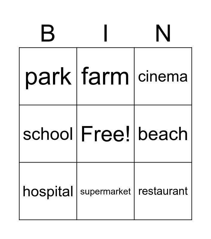 This bingo card has a free space and 8 words: beach, cinema, farm, hospital, park, restaurant, school and supermarket.