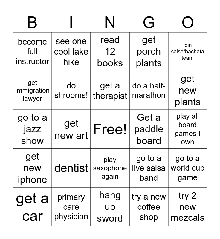 This bingo card has a free space and 24 words: dentist, primary care physician, get a therapist, get a car, join salsa/bachata team, become full instructor, get immigration lawyer, see one cool lake hike, Get a paddle board, play saxophone again, do a half-marathon, go to a jazz show, go to a live salsa band, go to a world cup game, do shrooms!, try a new coffee shop, play all board games I own, read 12 books, get new plants, get new art, try 2 new mezcals, get new iphone, get porch plants and hang up sword.