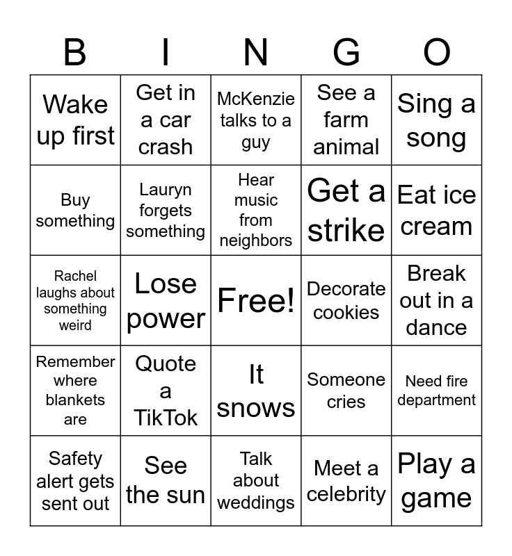 This bingo card has a free space and 27 words: Someone cries, See the Amish, Get a strike, Talk about weddings, Buy something, McKenzie talks to a guy, Get in a car crash, Remember where blankets are, Decorate cookies, Need fire department, Rachel laughs about something weird, See a farm animal, Safety alert gets sent out, See the sun, Eat ice cream, See a baby at church, Lauryn forgets something, Hear music from neighbors, Quote a TikTok, Wake up first, Break out in a dance, Meet a celebrity, Lose power, Play a game, It snows, Sing a song and Fall asleep in the middle of a conversation.