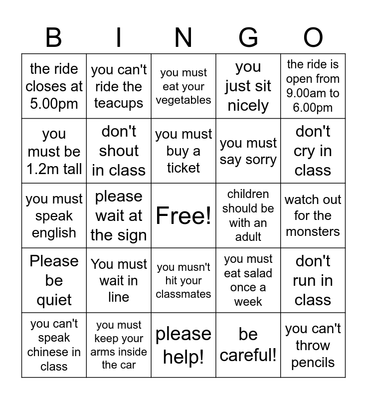 This bingo card has a free space and 24 words: You must wait in line, you must keep your arms inside the car, you must buy a ticket, you can't speak chinese in class, the ride is open from 9.00am to 6.00pm, the ride closes at 5.00pm, you must be 1.2m tall, you can't ride the teacups, children should be with an adult, you musn't hit your classmates, you must say sorry, you must speak english, you must eat salad once a week, don't run in class, don't shout in class, be careful!, watch out for the monsters, you must eat your vegetables, don't cry in class, please wait at the sign, you can't throw pencils, Please be quiet, you just sit nicely and please help!.