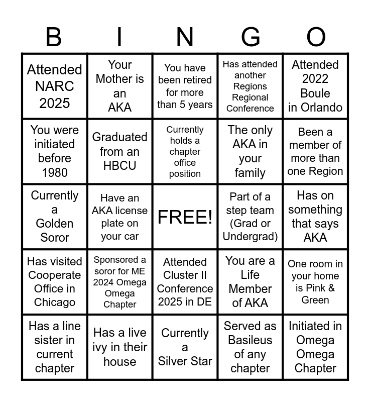 This bingo card has a free space and 24 words: Sponsored a soror for ME 2024 Omega Omega Chapter, Has a live ivy in their house, Currently holds a chapter office position, Has a line sister in current chapter, Attended 2022 Boule in Orlando, Attended NARC 2025, You were initiated before 1980, Your Mother is an AKA, Part of a step team (Grad or Undergrad), Attended Cluster II Conference 2025 in DE, The only AKA in your family, Currently a Golden Soror, You are a Life Member of AKA, One room in your home is Pink & Green, Graduated from an HBCU, Served as Basileus of any chapter, Has on something that says AKA, You have been retired for more than 5 years, Been a member of more than one Region, Have an AKA license plate on your car, Initiated in Omega Omega Chapter, Has visited Cooperate Office in Chicago, Has attended another Regions Regional Conference and Currently a Silver Star.