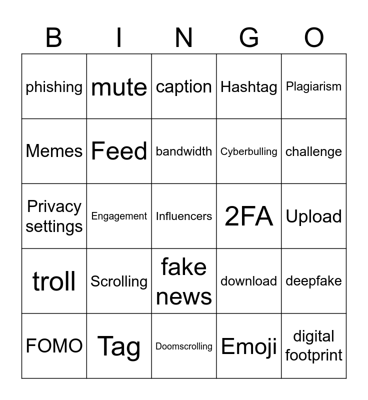 This bingo card has a free space and 24 words: Scrolling, Tag, bandwidth, FOMO, Plagiarism, phishing, Memes, mute, 2FA, fake news, Cyberbulling, Privacy settings, download, deepfake, Feed, Emoji, Upload, caption, challenge, Engagement, digital footprint, troll, Hashtag and Doomscrolling.