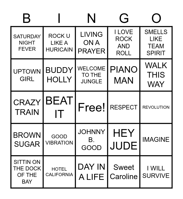 This bingo card has a free space and 25 words: GOOD VIBRATION, DAY IN A LIFE, WELCOME TO THE JUNGLE, SITTIN ON THE DOCK OF THE BAY, SMELLS LIKE TEAM SPIRIT, SATURDAY NIGHT FEVER, UPTOWN GIRL, ROCK U LIKE A HURICAIN, RESPECT, JOHNNY B. GOOD, PIANO MAN, CRAZY TRAIN, HEY JUDE, IMAGINE, BUDDY HOLLY, JUMP, REVOLUTION, LIVING ON A PRAYER, WALK THIS WAY, BEAT IT, I WILL SURVIVE, HOTEL CALIFORNIA, BROWN SUGAR, I LOVE ROCK AND ROLL and Sweet Caroline.