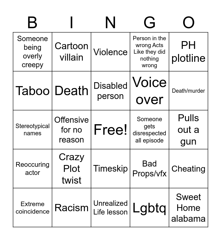 This bingo card has a free space and 24 words: Crazy Plot twist, Racism, Disabled person, Extreme coincidence, PH plotline, Someone being overly creepy, Taboo, Cartoon villain, Someone gets disrespected all episode, Timeskip, Voice over, Stereotypical names, Bad Props/vfx, Cheating, Death, Lgbtq, Pulls out a gun, Violence, Death/murder, Offensive for no reason, Sweet Home alabama, Reoccuring actor, Person in the wrong Acts Like they did nothing wrong and Unrealized Life lesson.