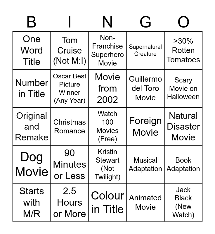 This bingo card has a free space and 24 words: 90 Minutes or Less, 2.5 Hours or More, Movie from 2002, Starts with M/R, >30% Rotten Tomatoes, One Word Title, Number in Title, Tom Cruise (Not M:I), Foreign Movie, Kristin Stewart (Not Twilight), Guillermo del Toro Movie, Original and Remake, Musical Adaptation, Book Adaptation, Oscar Best Picture Winner (Any Year), Animated Movie, Natural Disaster Movie, Non-Franchise Superhero Movie, Scary Movie on Halloween, Christmas Romance, Jack Black (New Watch), Dog Movie, Supernatural Creature and Colour in Title.