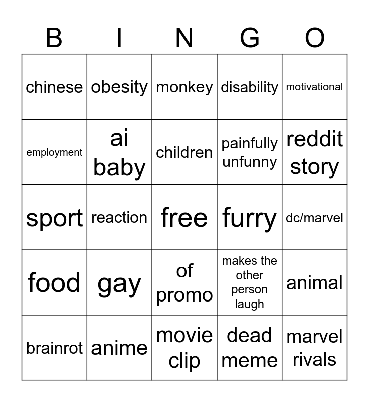 This bingo card has a free space and 29 words: brainrot, ai, reaction, podcast, chinese, monkey, ai baby, gay, furry, anime, dc/marvel, marvel rivals, movie clip, dead meme, reddit story, minecraft, of promo, food, motivational, sport, makes the other person laugh, challenges, painfully unfunny, employment, disability, obesity, animal, children and unemployment.