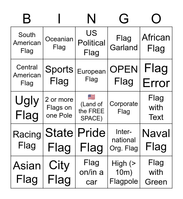 This bingo card has a free space and 24 words: State Flag, City Flag, European Flag, Asian Flag, African Flag, South American Flag, Central American Flag, Oceanian Flag, Corporate Flag, Pride Flag, OPEN Flag, Ugly Flag, Inter- national Org. Flag, Naval Flag, Sports Flag, High (> 10m) Flagpole, Flag with Text, US Political Flag, Flag Error, 2 or more Flags on one Pole, Flag with Green, Racing Flag, Flag Garland and Flag on/in a car.