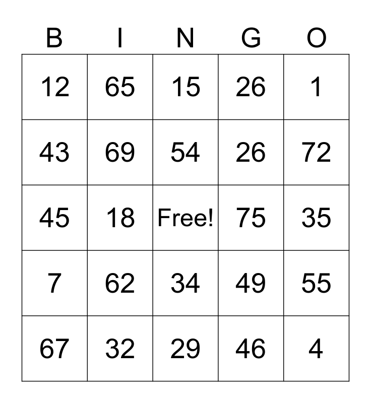 This bingo card has a free space and 24 words: 62, 32, 54, 67, 1, 12, 43, 65, 75, 34, 26, 45, 49, 55, 69, 46, 35, 15, 72, 18, 4, 7, 26 and 29.
