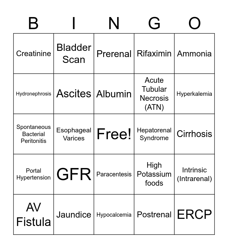 This bingo card has a free space and 40 words: Hepatic encephalopathy, Spontaneous Bacterial Peritonitis, AST and ALT, Ascites, Jaundice, Paracentesis, Albumin, Lactulose, Ammonia, Portal Hypertension, Esophageal Varices, Rifaximin, ERCP, Cirrhosis, Hepatorenal Syndrome, GFR, BUN, Creatinine, AKI, Prerenal, Intrinsic (Intrarenal), Postrenal, Acute Tubular Necrosis (ATN), Hydronephrosis, Nephrotoxins, Diuretic Stage, Fluid Restriction, Insulin and Dextrose, Uremia, Steal Syndrome, CRRT, AV Fistula, Octreotide, High Potassium foods, Hyperkalemia, Hypocalcemia, Metabolic Acidosis, Contract Induced AKI, Bladder Scan and Fulminant Hepatic Failure.