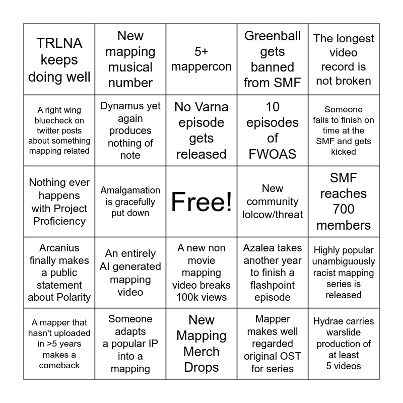 This bingo card has a free space and 24 words: An entirely AI generated mapping video, Someone adapts a popular IP into a mapping, No Varna episode gets released, A mapper that hasn't uploaded in >5 years makes a comeback, The longest video record is not broken, TRLNA keeps doing well, A right wing bluecheck on twitter posts about something mapping related, New mapping musical number, New community lolcow/threat, A new non movie mapping video breaks 100k views, 10 episodes of FWOAS, Nothing ever happens with Project Proficiency, Azalea takes another year to finish a flashpoint episode, Highly popular unambiguously racist mapping series is released, Dynamus yet again produces nothing of note, Mapper makes well regarded original OST for series, SMF reaches 700 members, 5+ mappercon, Someone fails to finish on time at the SMF and gets kicked, Amalgamation is gracefully put down, Hydrae carries warslide production of at least 5 videos, Arcanius finally makes a public statement about Polarity, Greenball gets banned from SMF and New Mapping Merch Drops.