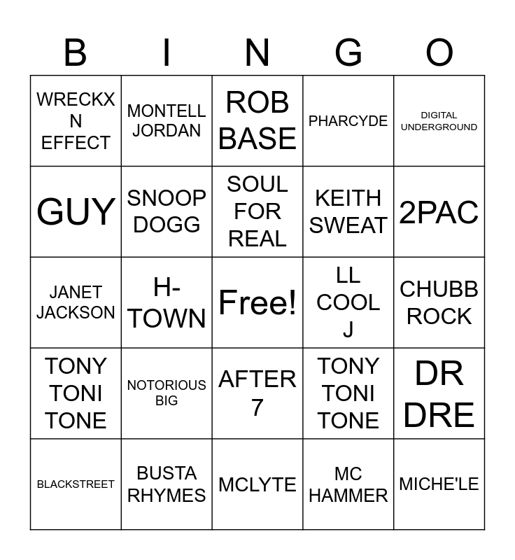 This bingo card has a free space and 24 words: NOTORIOUS BIG, BUSTA RHYMES, SOUL FOR REAL, BLACKSTREET, DIGITAL UNDERGROUND, WRECKX N EFFECT, GUY, MONTELL JORDAN, LL COOL J, AFTER 7, KEITH SWEAT, JANET JACKSON, TONY TONI TONE, DR DRE, SNOOP DOGG, MC HAMMER, CHUBB ROCK, ROB BASE, 2PAC, H-TOWN, MICHE'LE, TONY TONI TONE, PHARCYDE and MCLYTE.