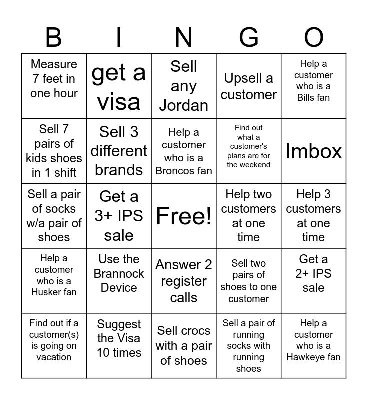 This bingo card has a free space and 24 words: Use the Brannock Device, Suggest the Visa 10 times, Help a customer who is a Broncos fan, Find out if a customer(s) is going on vacation, Help a customer who is a Bills fan, Measure 7 feet in one hour, Sell 7 pairs of kids shoes in 1 shift, get a visa, Help two customers at one time, Answer 2 register calls, Find out what a customer's plans are for the weekend, Sell a pair of socks w/a pair of shoes, Sell two pairs of shoes to one customer, Get a 2+ IPS sale, Sell 3 different brands, Sell a pair of running socks with running shoes, Help 3 customers at one time, Sell any Jordan, Imbox, Get a 3+ IPS sale, Help a customer who is a Hawkeye fan, Help a customer who is a Husker fan, Upsell a customer and Sell crocs with a pair of shoes.