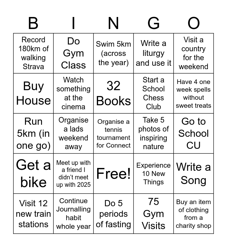 This bingo card has 26 words: Free!, 75 Gym Visits, 32 Books, Continue Journalling habit whole year, Visit a country for the weekend, Record 180km of walking Strava, Buy House, Do Gym Class, Go to School CU, Experience 10 New Things, Start a School Chess Club, Run 5km (in one go), Write a Song, Visit 12 new train stations, Organise a lads weekend away, Play hide and seek, Write a liturgy and use it, Get a bike, Swim 5km (across the year), Organise a tennis tournament for Connect, Have 4 one week spells without sweet treats, Do 5 periods of fasting, Take 5 photos of inspiring nature, Meet up with a friend I didn’t meet up with 2025, Watch something at the cinema and Buy an item of clothing from a charity shop.