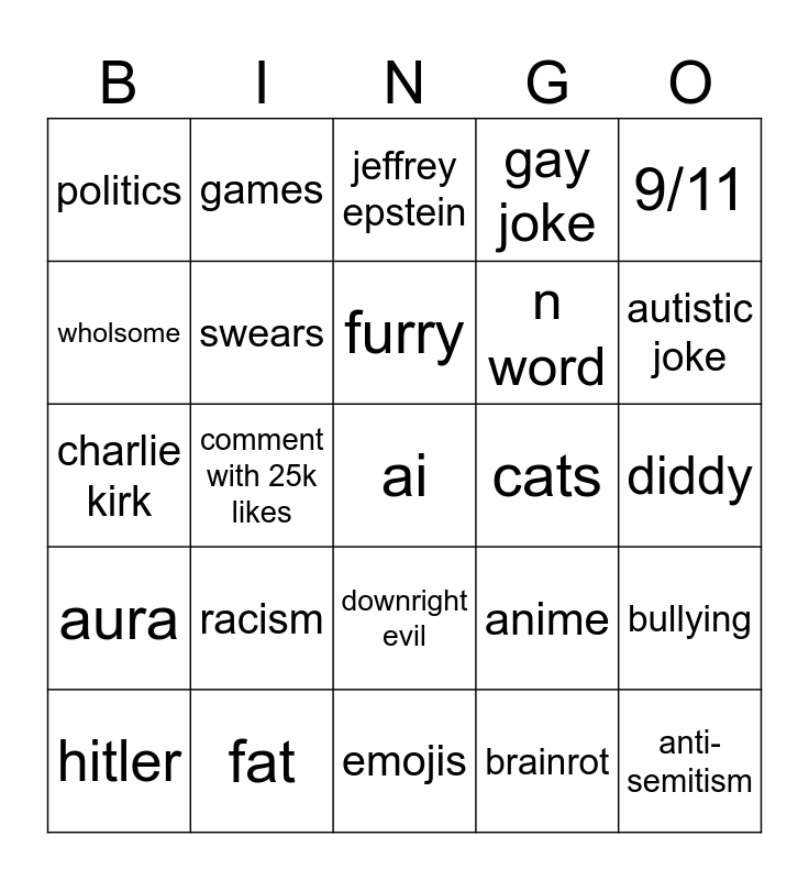 This bingo card has a free space and 24 words: racism, fat, furry, hitler, 9/11, politics, wholsome, games, cats, downright evil, n word, charlie kirk, anime, bullying, swears, brainrot, diddy, jeffrey epstein, autistic joke, comment with 25k likes, anti-semitism, aura, gay joke and emojis.