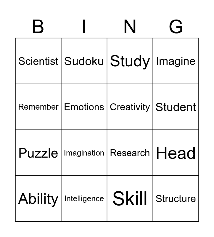 This bingo card has 16 words: Intelligence, Head, Study, Scientist, Puzzle, Sudoku, Research, Skill, Remember, Emotions, Ability, Imagine, Imagination, Student, Creativity and Structure.