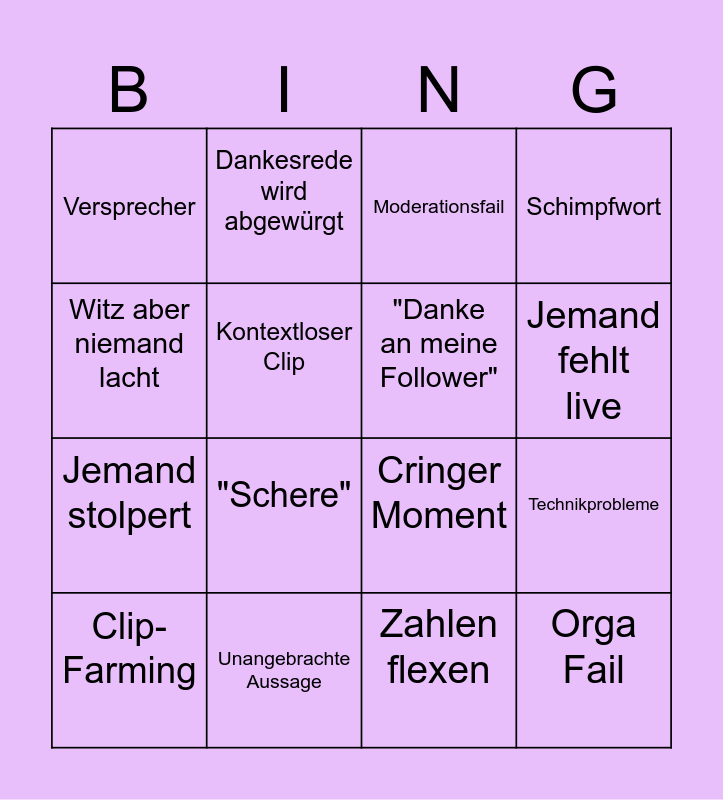 This bingo card has 16 words: Unangebrachte Aussage, Technikprobleme, Moderationsfail, Versprecher, Jemand stolpert, Dankesrede wird abgewürgt, Cringer Moment, Zahlen flexen, Witz aber niemand lacht, Kontextloser Clip, Clip-Farming, Schimpfwort, "Schere", Jemand fehlt live, "Danke an meine Follower" and Orga Fail.