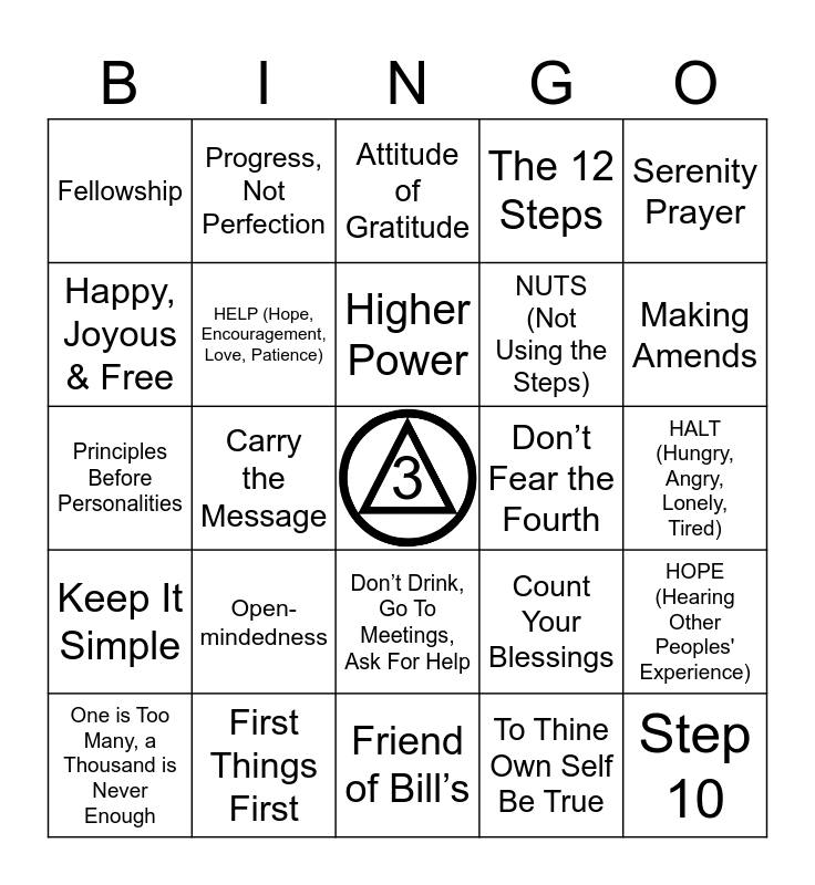This bingo card has a free space and 73 words: Acceptance, Anonymity, Attitude of Gratitude, Bill W & Dr. Bob, Bring the Body, the Mind Will Follow, Came to Believe, Carry the Message, Character Defects, Count Your Blessings, Courage to Change, Daily Inventory, Daily Reflection, Don’t Drink, Go To Meetings, Ask For Help, Don’t Fear the Fourth, Easy Does It, Fellowship, First Things First, Friend of Bill’s, GOD (Group of Drunks), HALT (Hungry, Angry, Lonely, Tired), Happy, Joyous & Free, HELP (Hope, Encouragement, Love, Patience), Higher Power, Honesty, HOPE (Hearing Other Peoples' Experience), Humility, I Can’t, He Can, I Think I’ll Let Him, It Works if You Work It, Just for Today, Just For Today, Keep It Simple, Let Go and Let God, Letting Go, Live and Let Live, Making Amends, Miracle, More Will Be Revealed, Newcomer, NUTS (Not Using the Steps), One Day at a Time, One is Too Many, a Thousand is Never Enough, Open-mindedness, Pause, Pray, Proceed, Powerlessness, Prayer & Meditation, Principles Before Personalities, Progress, Not Perfection, Recovery, Rule 62 (Don’t Take Yourself So Seriously!), Serenity Prayer, Service, Spiritual Awakening, Spirituality, Sponsorship, Step 10, Step Work, Steps 1, 2, 3, Steps 6 & 7, Steps 8 & 9, Stick With the Winners, Suit Up & Show Up, Surrender, The 12 Concepts, The 12 Steps, The 12 Traditions, The Big Book, This Too Shall Pass, TIME (Things I Must Earn), To Thine Own Self Be True, Turn it Over, Unity, Willingness and You Are Not Alone.