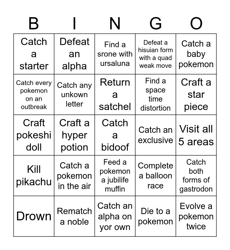 This bingo card has a free space and 24 words: Catch a pokemon in the air, Rematch a noble, Return a satchel, Drown, Catch a baby pokemon, Catch a starter, Catch every pokemon on an outbreak, Defeat an alpha, Catch an exclusive, Feed a pokemon a jubilife muffin, Find a space time distortion, Craft pokeshi doll, Complete a balloon race, Catch both forms of gastrodon, Catch any unkown letter, Die to a pokemon, Visit all 5 areas, Find a srone with ursaluna, Craft a star piece, Craft a hyper potion, Evolve a pokemon twice, Kill pikachu, Defeat a hisuian form with a quad weak move and Catch an alpha on yor own.