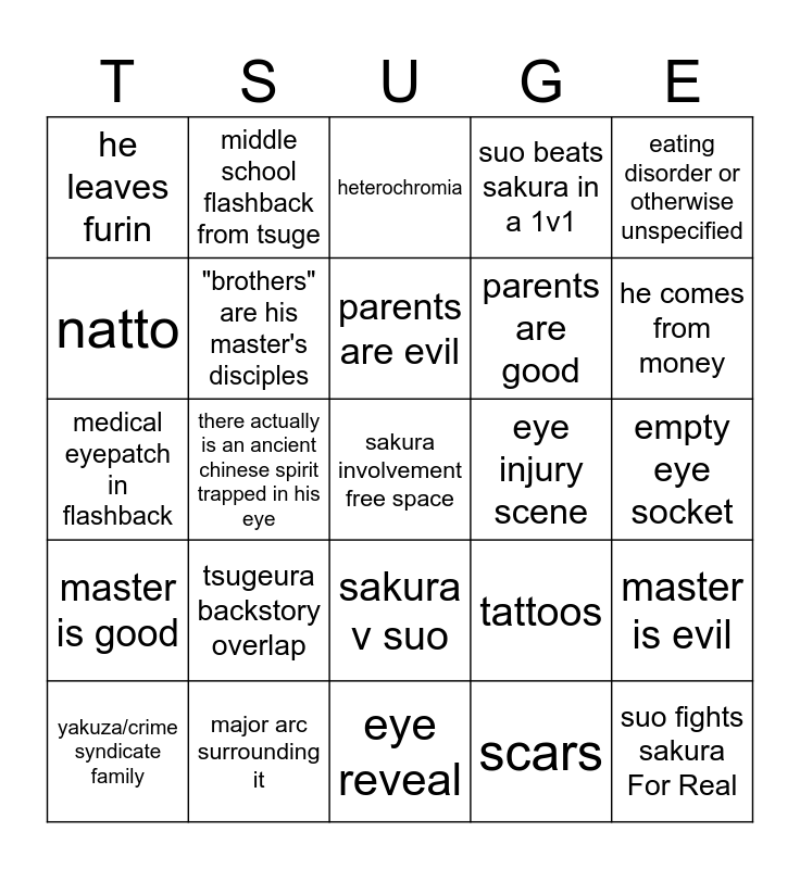 This bingo card has a free space and 24 words: tsugeura backstory overlap, major arc surrounding it, parents are evil, yakuza/crime syndicate family, eating disorder or otherwise unspecified, he leaves furin, natto, middle school flashback from tsuge, eye injury scene, sakura v suo, parents are good, medical eyepatch in flashback, tattoos, master is evil, "brothers" are his master's disciples, scars, empty eye socket, heterochromia, he comes from money, there actually is an ancient chinese spirit trapped in his eye, suo fights sakura For Real, master is good, suo beats sakura in a 1v1 and eye reveal.