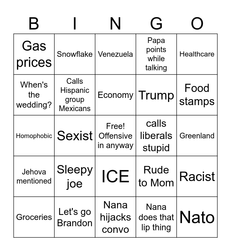 This bingo card has a free space and 24 words: Sleepy joe, Let's go Brandon, Economy, Groceries, Healthcare, Gas prices, When's the wedding?, Snowflake, calls liberals stupid, ICE, Trump, Homophobic, Rude to Mom, Racist, Calls Hispanic group Mexicans, Nana does that lip thing, Greenland, Venezuela, Food stamps, Sexist, Nato, Jehova mentioned, Papa points while talking and Nana hijacks convo.