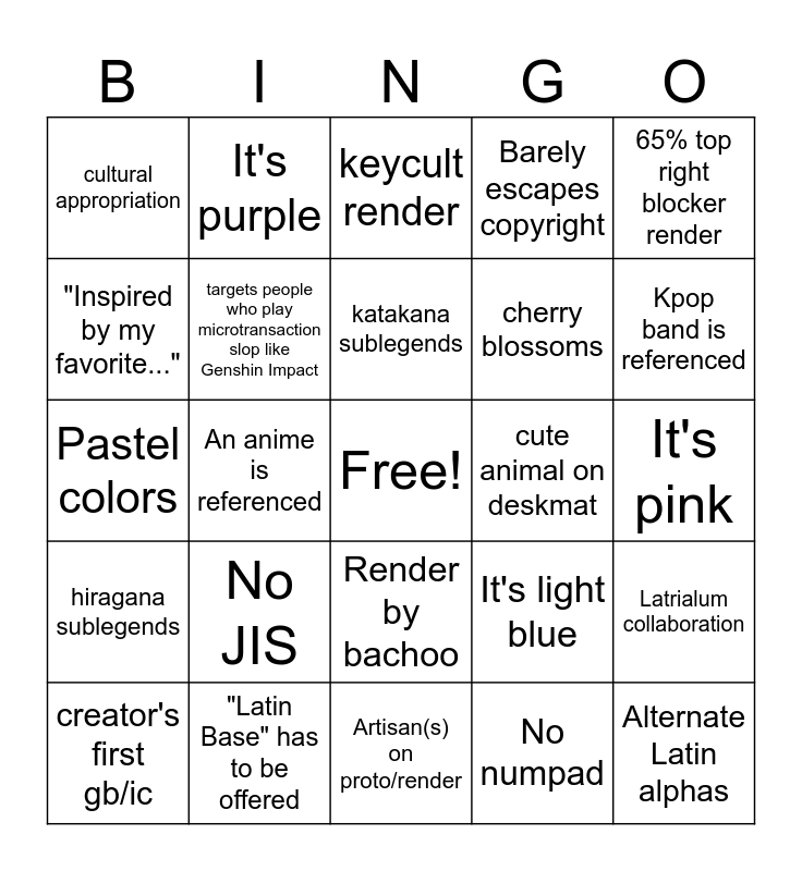 This bingo card has a free space and 24 words: No JIS, "Latin Base" has to be offered, katakana sublegends, creator's first gb/ic, 65% top right blocker render, cultural appropriation, "Inspired by my favorite...", It's purple, cute animal on deskmat, Render by bachoo, cherry blossoms, Pastel colors, It's light blue, Latrialum collaboration, targets people who play microtransaction slop like Genshin Impact, No numpad, It's pink, keycult render, Kpop band is referenced, An anime is referenced, Alternate Latin alphas, hiragana sublegends, Barely escapes copyright and Artisan(s) on proto/render.