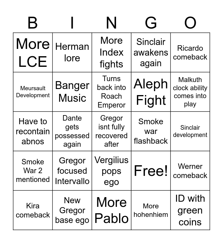 This bingo card has 25 words: Gregor focused Intervallo, More Pablo, Turns back into Roach Emperor, Kira comeback, Ricardo comeback, More LCE, Meursault Development, Herman lore, Smoke war flashback, Vergilius pops ego, Aleph Fight, Have to recontain abnos, Free!, Werner comeback, Banger Music, ID with green coins, Sinclair development, More Index fights, Malkuth clock ability comes into play, Dante gets possessed again, Gregor isnt fully recovered after, New Gregor base ego, Smoke War 2 mentioned, Sinclair awakens again and More hohenhiem.