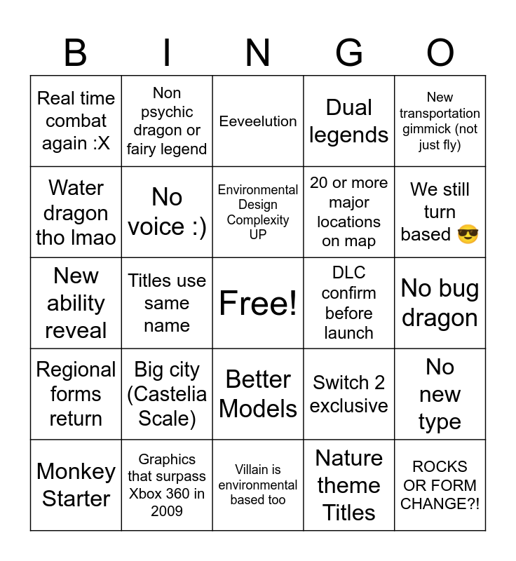 This bingo card has a free space and 24 words: Monkey Starter, Big city (Castelia Scale), Environmental Design Complexity UP, Nature theme Titles, New transportation gimmick (not just fly), Real time combat again :X, Non psychic dragon or fairy legend, Eeveelution, DLC confirm before launch, No bug dragon, New ability reveal, No voice :), Switch 2 exclusive, No new type, Water dragon tho lmao, Graphics that surpass Xbox 360 in 2009, Villain is environmental based too, Dual legends, We still turn based 😎, Regional forms return, Titles use same name, Better Models, 20 or more major locations on map and ROCKS OR FORM CHANGE?!.
