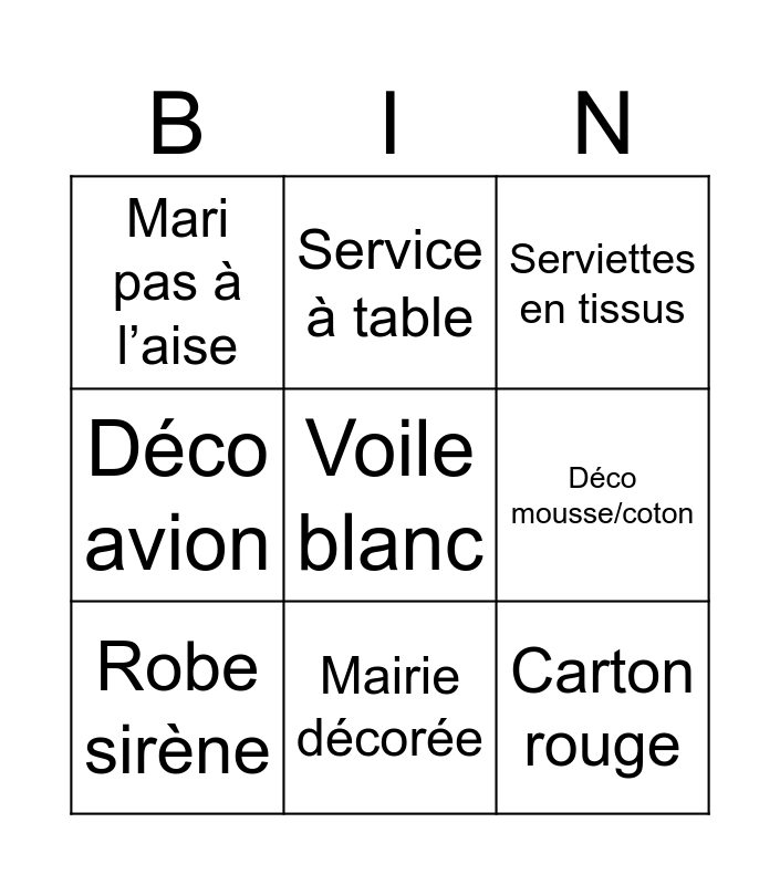 This bingo card has a free space and 8 words: Déco mousse/coton, Serviettes en tissus, Service à table, Robe sirène, Mari pas à l’aise, Carton rouge, Déco avion and Mairie décorée.