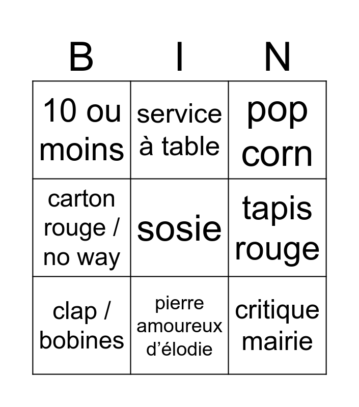 This bingo card has a free space and 8 words: tapis rouge, pop corn, service à table, clap / bobines, 10 ou moins, critique mairie, carton rouge / no way and pierre amoureux d’élodie.