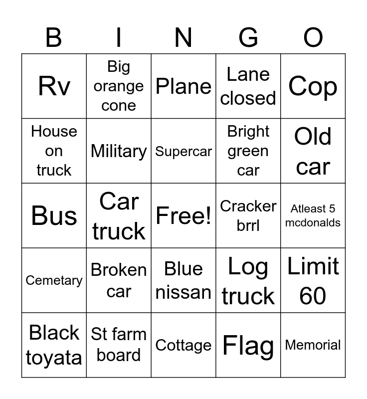 This bingo card has a free space and 24 words: Broken car, St farm board, Supercar, Black toyata, Cop, Rv, House on truck, Big orange cone, Cracker brrl, Blue nissan, Bright green car, Bus, Log truck, Limit 60, Military, Flag, Atleast 5 mcdonalds, Plane, Old car, Car truck, Memorial, Cemetary, Lane closed and Cottage.