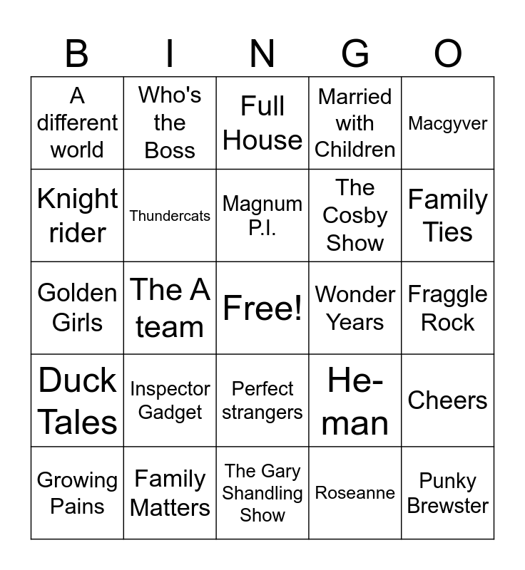 This bingo card has a free space and 28 words: Cheers, Baywatch, The Cosby Show, Roseanne, Knight rider, Full House, Who's the Boss, Duck Tales, Wonder Years, Growing Pains, Golden Girls, Married with Children, Family Matters, The Gary Shandling Show, Family Ties, Miami Vice, Inspector Gadget, Thundercats, Magnum P.I., Perfect strangers, A different world, Night Court, Punky Brewster, The A team, Fraggle Rock, He-man, Macgyver and Doggie Howser MD.