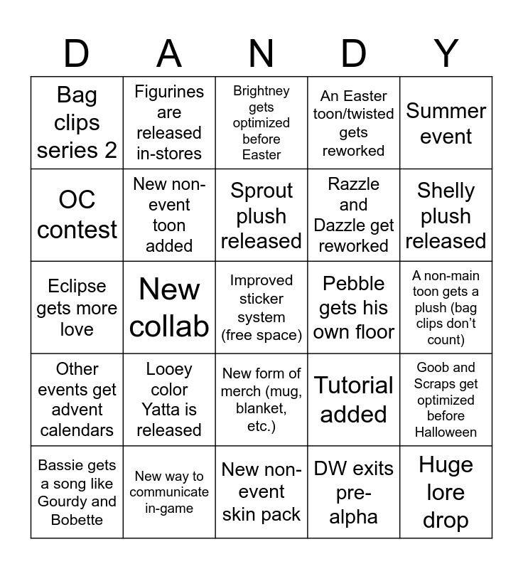 This bingo card has a free space and 24 words: Looey color Yatta is released, New way to communicate in-game, Sprout plush released, Bassie gets a song like Gourdy and Bobette, Summer event, Bag clips series 2, OC contest, Figurines are released in-stores, Pebble gets his own floor, New form of merch (mug, blanket, etc.), Razzle and Dazzle get reworked, Eclipse gets more love, Tutorial added, Goob and Scraps get optimized before Halloween, New non-event toon added, DW exits pre-alpha, A non-main toon gets a plush (bag clips don’t count), Brightney gets optimized before Easter, Shelly plush released, New collab, Huge lore drop, Other events get advent calendars, An Easter toon/twisted gets reworked and New non-event skin pack.