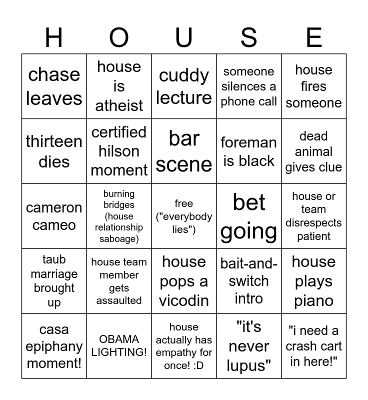 This bingo card has a free space and 24 words: house team member gets assaulted, OBAMA LIGHTING!, bar scene, casa epiphany moment!, house fires someone, chase leaves, thirteen dies, house is atheist, bet going, house pops a vicodin, foreman is black, cameron cameo, bait-and-switch intro, house plays piano, certified hilson moment, "it's never lupus", house or team disrespects patient, cuddy lecture, dead animal gives clue, burning bridges (house relationship saboage), "i need a crash cart in here!", taub marriage brought up, someone silences a phone call and house actually has empathy for once! :D.