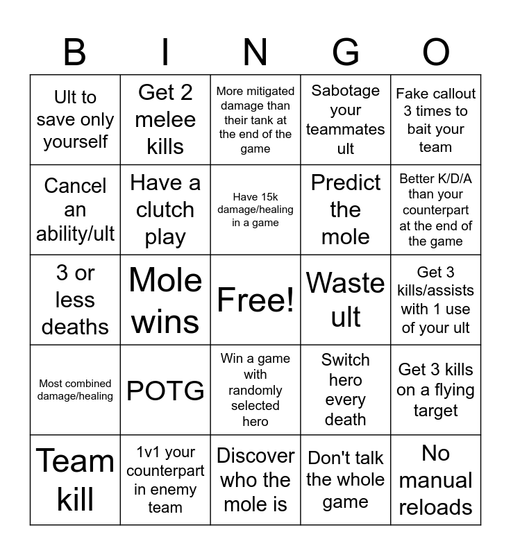 This bingo card has a free space and 29 words: Team kill, Emote after you kill somebody, Mole wins, Solo ult somebody, Ult to save only yourself, More mitigated damage than their tank at the end of the game, Have a clutch play, POTG, Waste ult, 1v1 your counterpart in enemy team, Get 3 kills/assists with 1 use of your ult, No manual reloads, Discover who the mole is, Don't talk the whole game, Better K/D/A than your counterpart at the end of the game, At least 40% of your shots hit, Win a game with randomly selected hero, Most combined damage/healing, Fake callout 3 times to bait your team, 3 or less deaths, Switch hero every death, Survive on less than 10hp, Predict the mole, Cancel an ability/ult, Sabotage your teammates ult, Get 2 melee kills, Get 3 kills on a flying target, Have 15k damage/healing in a game and Mole saves enemy.
