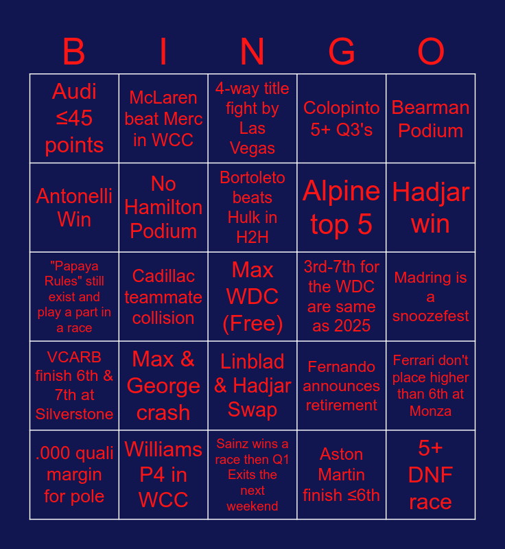 This bingo card has a free space and 24 words: Max & George crash, Williams P4 in WCC, Bortoleto beats Hulk in H2H, .000 quali margin for pole, Bearman Podium, Audi ≤45 points, Antonelli Win, McLaren beat Merc in WCC, 3rd-7th for the WDC are same as 2025, Linblad & Hadjar Swap, Alpine top 5, "Papaya Rules" still exist and play a part in a race, Fernando announces retirement, Ferrari don't place higher than 6th at Monza, No Hamilton Podium, Aston Martin finish ≤6th, Madring is a snoozefest, 4-way title fight by Las Vegas, Hadjar win, Cadillac teammate collision, 5+ DNF race, VCARB finish 6th & 7th at Silverstone, Colopinto 5+ Q3's and Sainz wins a race then Q1 Exits the next weekend.
