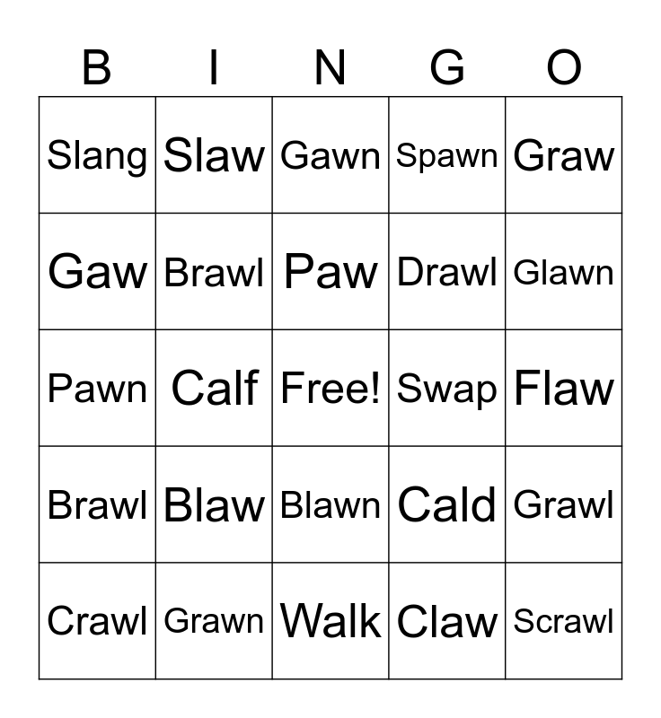 This bingo card has a free space and 44 words: Sprawl, Scrawl, Spawl, Crawl, Clap, Claw, Gawn, Grawl, Graw, Grawn, Spawn, Swap, Blawn, Blaw, Fald, Walk, Flag, Pawn, Prawn, Glawn, Slaw, Clang, Flang, Slang, Dawn, Flaw, Glaw, Clawn, Cald, Brawl, Bawl, Grawl, Drawl, Walf, Calf, Fawn, Lang, Law, Paw, Gaw, Drawl, Frawl, Brawl and Blag.