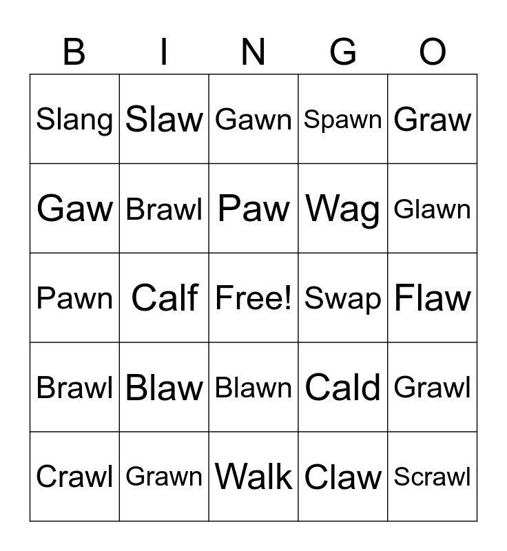 This bingo card has a free space and 44 words: Sprawl, Scrawl, Spawl, Crawl, Clap, Claw, Gawn, Grawl, Graw, Grawn, Spawn, Swap, Blawn, Blaw, Fald, Walk, Flag, Pawn, Prawn, Glawn, Slaw, Clang, Flang, Slang, Dawn, Flaw, Glaw, Clawn, Cald, Brawl, Bawl, Grawl, Drawl, Walf, Calf, Fawn, Lang, Law, Paw, Gaw, Wag, Frawl, Brawl and Flap.