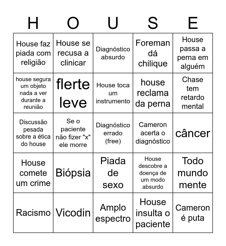 This bingo card has a free space and 44 words: House fala do corpo da cuddy, Cameron é puta, House fala sobre pornô, Racismo, Pedofilia, House insulta o paciente, Diagnóstico absurdo, Wilson questiona amizade com House, House passa a perna em alguém, Vicodin, Foreman dá chilique, Cameron acerta o diagnóstico, Piada de sexo, Biópsia, Esteróides, Amplo espectro, "Enfermeira!", Discussão pesada sobre a ética do house, Anti-inflamatório, Chase tem retardo mental, House se recusa a clinicar, Lupus, Ressonância, House faz piada com religião, House entra na sala de cirurgia sem estar esterelizado, câncer, paciente é um idiota, house tava certo no final, House descobre a doença de um modo absurdo, House comete um crime, House enche o saco da cuddy, Todo mundo mente, Foreman levanta as sobrancelhas, house insulta a própria equipe, Se o paciente não fizer "x" ele morre, house fala da fertilidade da cuddy, antibióticos, alguém invade a casa do paciente, House toca um instrumento, house segura um objeto nada a ver durante a reunião, house reclama da perna, alguém comenta sobre o vício do hause, flerte leve and tenis foda do house.
