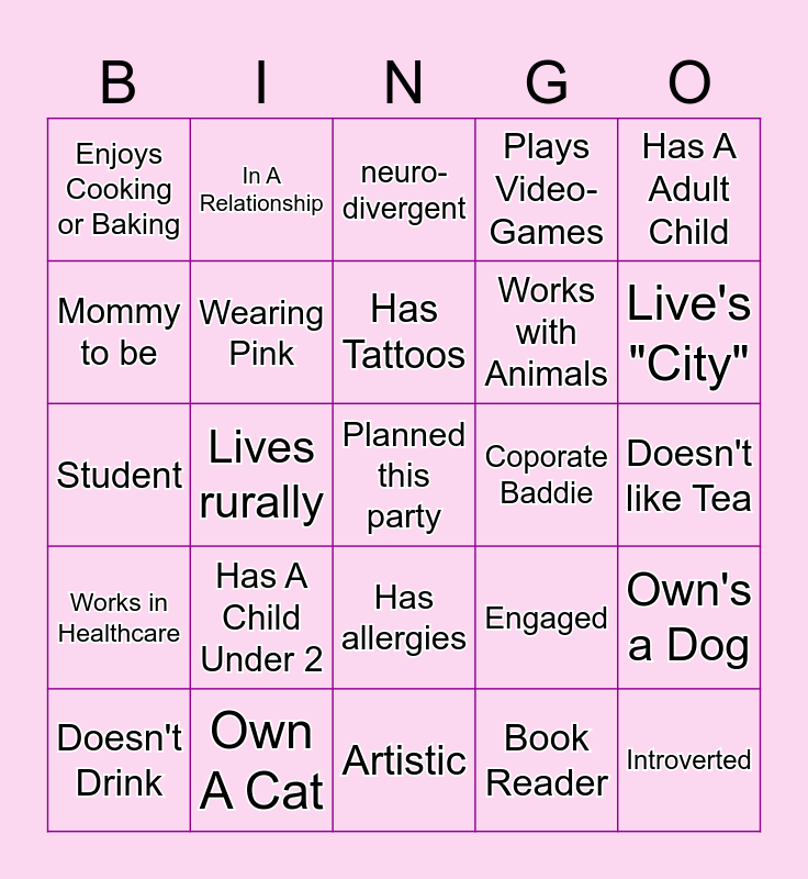 This bingo card has a free space and 24 words: Has A Child Under 2, Own A Cat, Has Tattoos, Doesn't Drink, Has A Adult Child, Enjoys Cooking or Baking, Mommy to be, In A Relationship, Coporate Baddie, Has allergies, Works with Animals, Student, Engaged, Own's a Dog, Wearing Pink, Book Reader, Doesn't like Tea, neuro-divergent, Live's "City", Lives rurally, Introverted, Works in Healthcare, Plays Video-Games and Artistic.