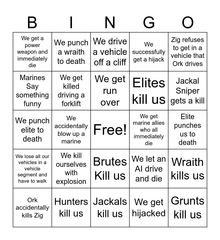 This bingo card has a free space and 29 words: Ork accidentally kills Zig, Zig accidentally kills Ork, We accidentally blow up a marine, Ork Shoves a vehicle somewhere it can't go, We get a power weapon and immediately die, We drive a vehicle off a cliff, We get killed driving a forklift, We kill ourselves with explosion, We get marine allies who all immediately die, Hunters kill us, Elite punches us to death, Grunts kill us, Jackals kill us, We get hijacked, Jackal Sniper gets a kill, Drones kill us, Brutes Kill us, We lose all our vehicles in a vehicle segment and have to walk, Zig refuses to get in a vehicle that Ork drives, We punch elite to death, We let an AI drive and die, We accidentally run over a marine, Elites kill us, Marines Say something funny, We successfully get a hijack, We punch a wraith to death, Wraith kills us, We get run over and We get an assassination.