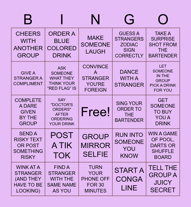 This bingo card has a free space and 26 words: GROUP MIRROR SELFIE, START A CONGA LINE, CONVINCE A STRANGER YOU'RE FOREIGN, FIND A STRANGER WITH THE SAME NAME AS YOU, TAKE A SURPRISE SHOT FROM THE BARTENDER, CHEERS WITH ANOTHER GROUP, GIVE A STRANGER A COMPLIMENT, ORDER A BLUE COLORED DRINK, GET SOMEONE TO BUY YOU A DRINK, RUN INTO SOMEONE YOU KNOW, DANCE WITH A STRANGER, COMPLETE A DARE GIVEN BY THE GROUP, WIN A GAME OF POOL, DARTS OR SHUFFLE BOARD, WINK AT A STRANGER (AND THEY HAVE TO BE LOOKING), SAY "DOCTOR'S ORDERS" AFTER ORDERING YOUR DRINK, PLAY A "BAD" OR GUILTY PLEASURE SONG ON TOUCHTUNES, GUESS A STRANGERS ZODIAC SIGN CORRECTLY, SEND A RISKY TEXT OR POST SOMETHING RISKY, MAKE SOMEONE LAUGH, TELL THE GROUP A JUICY SECRET, LET SOMEONE IN THE GROUP PICK A DRINK FOR YOU, TURN YOUR PHONE OFF FOR 30 MINUTES, SING YOUR ORDER TO THE BARTENDER, POST A TIK TOK, ASK SOMEONE WHAT THEY THINK YOUR “RED FLAG” IS and ASK SOMEONE WHAT BUTTON WE’RE ON IN THE YEAR.