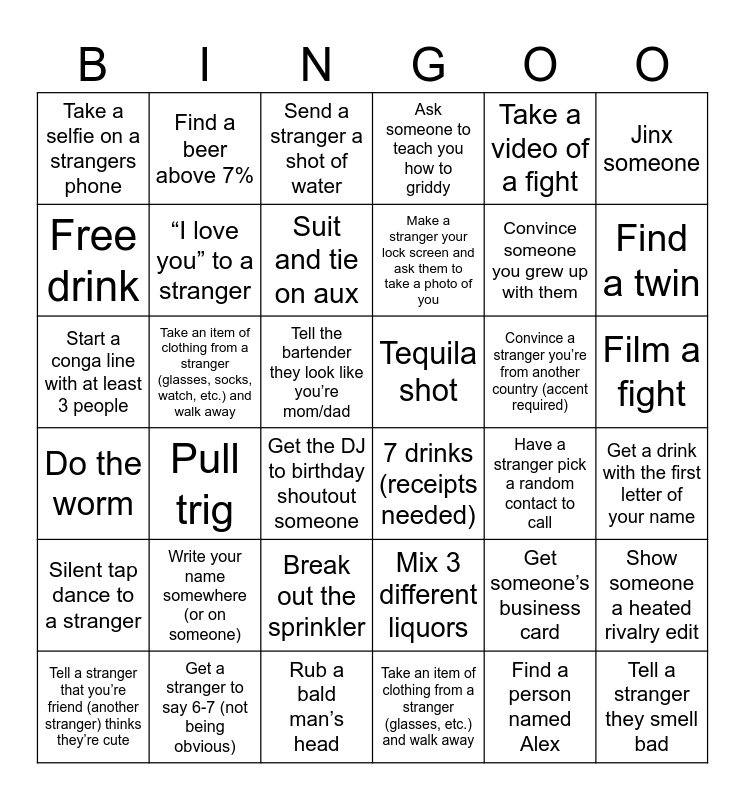 This bingo card has 36 words: Do the worm, Pull trig, Rub a bald man’s head, Make a stranger your lock screen and ask them to take a photo of you, Convince a stranger you’re from another country (accent required), Film a fight, Take a selfie on a strangers phone, Get a stranger to say 6-7 (not being obvious), Send a stranger a shot of water, Mix 3 different liquors, Convince someone you grew up with them, Jinx someone, Silent tap dance to a stranger, Take an item of clothing from a stranger (glasses, socks, watch, etc.) and walk away, Suit and tie on aux, Ask someone to teach you how to griddy, Get someone’s business card, Get a drink with the first letter of your name, Free drink, “I love you” to a stranger, Get the DJ to birthday shoutout someone, 7 drinks (receipts needed), Have a stranger pick a random contact to call, Show someone a heated rivalry edit, Start a conga line with at least 3 people, Find a beer above 7%, Tell the bartender they look like you’re mom/dad, Take an item of clothing from a stranger (glasses, etc.) and walk away, Take a video of a fight, Find a twin, Tell a stranger that you’re friend (another stranger) thinks they’re cute, Write your name somewhere (or on someone), Break out the sprinkler, Tequila shot, Find a person named Alex and Tell a stranger they smell bad.