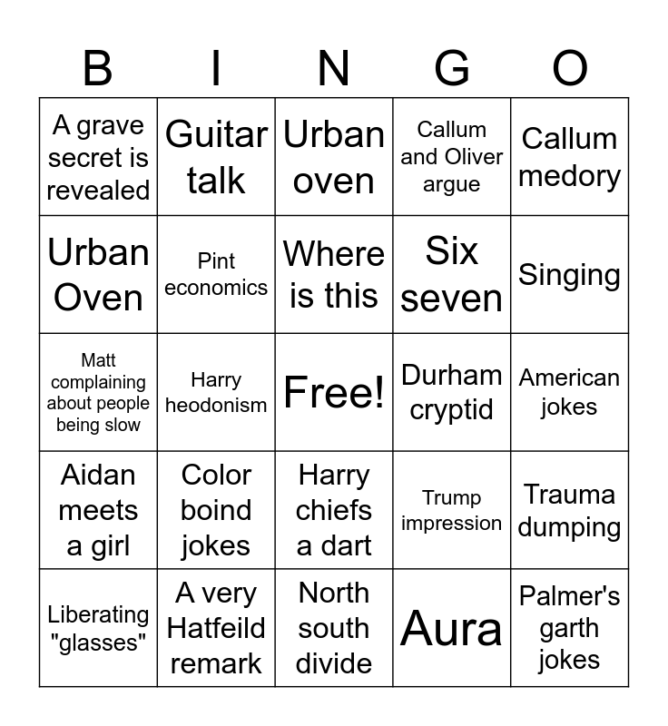 This bingo card has a free space and 54 words: Aidan Meets a boy, Aidan meets a girl, Aidan slurs his words, Harry flirts with a taken girl, Harry chiefs a dart, Oliver says some phil bullshit, Callum and Oliver argue, Matt complaining at Bruce, Urban Oven, Brucing it, A grave secret is revealed, Gay jokes, A very Hatfeild remark, Liberating "glasses", Spilt drink, North south divide, Palmer's garth jokes, Six seven, Tory jokes, American jokes, Trump impression, Aiden playing piano, Durham cryptid, Callum medory, Jqm session, Guitar talk, Oliver is good at something random, Fashion compliments, Making fun of other colleges, Aura, Death threats, Bad languages, Bad geography, Folded pizza, Urban oven, Pool/table tennis/foosball, Matt complaining about people being slow, Trauma dumping, And the crowd goes mild, Pint economics, Weed jokes, Bruce and Harry are posh, Putting on a posh accent, Charlie Kirk, Color boind jokes, Tism jokes, Mat shouts, Harry thinks he's done somthing wron/offends someone, Where is this, Harry heodonism, Singing, Callum anima, Blashpymey and Hattie talks about his exes.