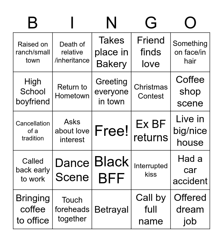 This bingo card has a free space and 24 words: Dance Scene, Touch foreheads together, Greeting everyone in town, Bringing coffee to office, Something on face/in hair, Raised on ranch/small town, High School boyfriend, Death of relative /inheritance, Ex BF returns, Black BFF, Christmas Contest, Cancellation of a tradition, Interrupted kiss, Had a car accident, Return to Hometown, Call by full name, Live in big/nice house, Takes place in Bakery, Coffee shop scene, Asks about love interest, Offered dream job, Called back early to work, Friend finds love and Betrayal.
